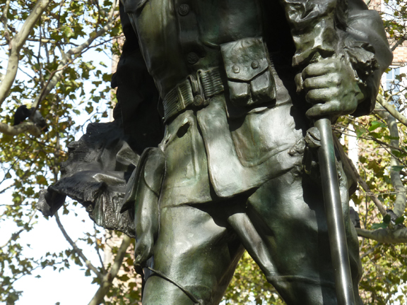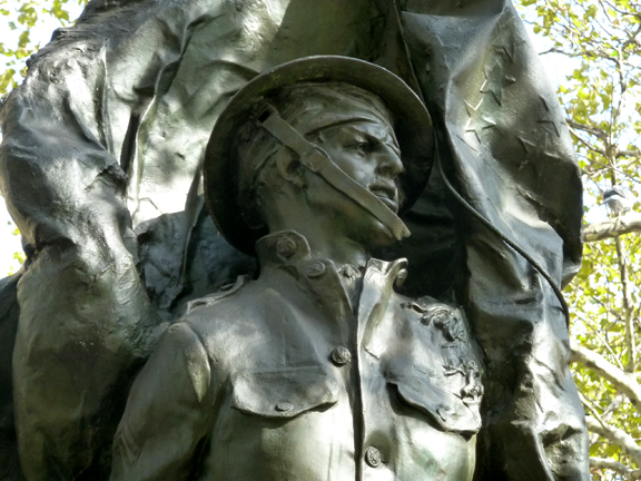 Standing on a gray Maine granite pedestal, this dramatic bronze shows a foot soldier—called a doughboy—holding an American flag that engulfs him. This is my second-favorite work of art in a city park. It is wonderfully alive! The soldier has his pistol drawn in his right hand and the weight of his body is shifted to the right left. His mouth is open, yelling. The doughboy’s movement can be felt and his cry can be heard. The grip of his left hand on the flag’s staff is tight. From the stars of the flag and its fringe on the man’s shoulder to the ‘U.S.’ embossed on the flap of the holster and the cord that ties it to the soldier’s leg, the detailing is astonishing! At the same time there is something raw about the figure. I find it thrilling!