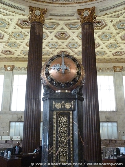 If the Dime’s exterior impresses; the interior dazzles, outshining its architectural skin. It takes your breath away! Just as the exterior was built as a temple, so the interior was similarly designed. The rotunda, supported by a dozen, soaring, red-marble columns made from stone imported directly from ancient Greek quarries, is the centerpiece. Client services uses this space today.