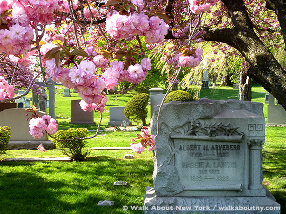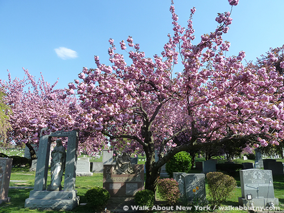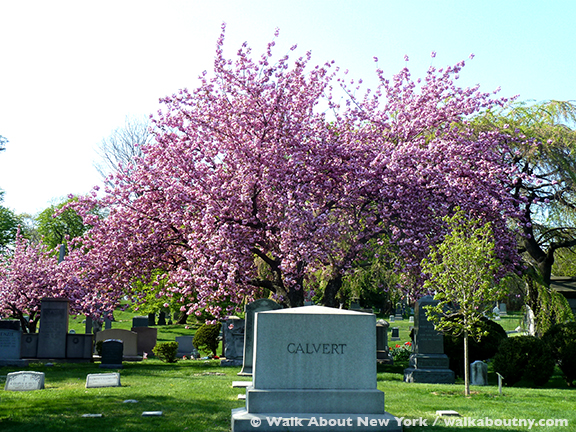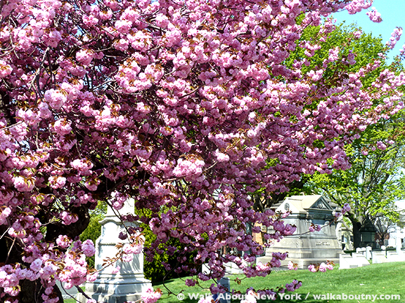Primarily found in Japan, the Kwanzan Cherry Tree grows in the United States as well. One place is Green-Wood Cemetery, a National Historic Landmark in Brooklyn. During our Gay Graves Tour at Green-Wood we were treated to the sight of its Kwanzan Cherry Trees in full bloom. Located mostly near the 25th Street side of the grounds, the trees’ flowers aren’t just pink but “Double Pink.” This means twice as many flowers bloom than do other trees.