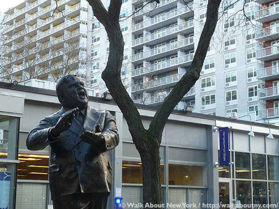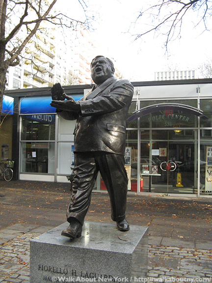 In the early 1990s, the Friends of La Guardia Place began renovating the public plazas along the street’s east side. In addition to improved landscaping, the organization commissioned a sculpture of La Guardia. It was a fitting location because this had been the neighborhood where he was raised. Unveiled in 1994, this dynamic, full-length, larger-than-life figure shows Mayor La Guardia clapping in mid-stride, with his mouth wide open as if in a cheer.