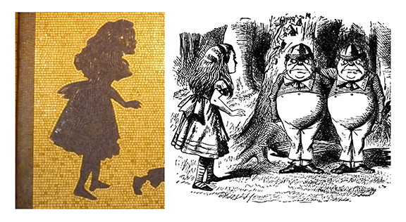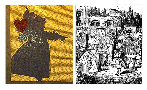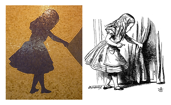 The artist Liliana Porter (1941– ) designed the glass mosaic panels in such a way that allows the viewer to fill in the details of Alice and her Wonderland friends represented in the silhouetted figures. Ms. Porter, an Argentine native living in New York since 1964, based her work on the original illustrations by John Tenniel (1820–1914) for the Macmillan Publishers’ Alice’s Adventures in Wonderland.