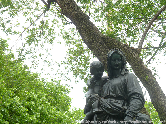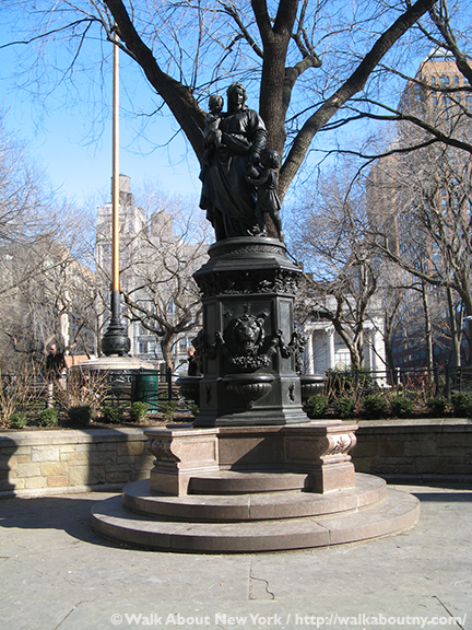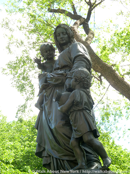 For the Union Square fountain Herr Donndorf designed a figural grouping. The woman is the over life-size, allegorical figure, Charity with two children. In addition to carrying an infant, she holds a pitcher, from which she is pouring water aided by a small child at her side. Allegorical images of Charity are typically connected with buildings for charitable purposes or churches, sometimes with Faith and Hope, making up the Three Virtues. Charity is usually a matronly figure, often with a head covering, and robed, giving her the look of the Blessed Virgin Mary. She may have her hand clasped to her breast, or have one or both breasts exposed, about to nurse an infant. Two or more infants or small children often accompany her. She is likely to be holding one of the infants. A less common pose shows Charity with her arm around the shoulder of an adult. If she has a free hand she may be offering food or a coin.
