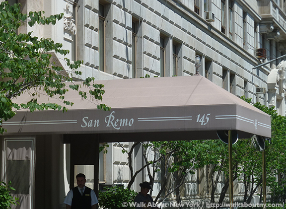 This is the third in our series of articles covering the towered apartment buildings that make the unique skyline of Central Park West so distinctive. We move up the avenue from our most recent story about the Majestic Apartments, at the corner of Central Park West and West. 72nd Street, only two blocks. The San Remo spans the block front from West 74th to West 75th Streets. It has two address numbers, 145 and 146 Central Park West. The doors at each number lead to spacious separate lobbies, featuring terrazzo floors, marble-clad walls, bronze and frosted glass light fixtures, and separate elevator banks, serving the different towers.