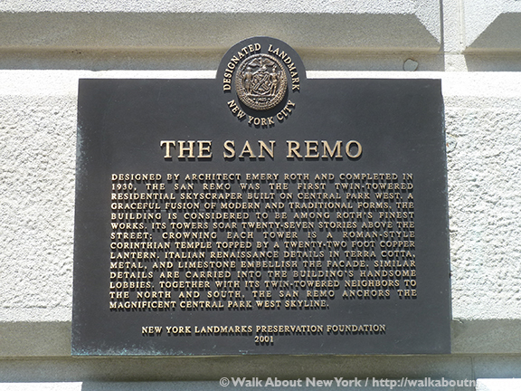The San Remo began construction in 1929, only weeks before the stock market crash; and was completed in 1930. It was one of the last great New York buildings planned and constructed in the Roaring 20s. The Empire State Building in Midtown was another.