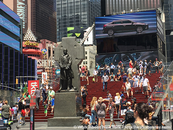 Duffy Square was enlarged and enhanced. The monument to Father Duffy stands in front of a striking amphitheater-styled staircase that is constructed of red glass. It is 27 steps high, with seating space for more than 500 people. The state-of-the-art, slip-resistant glass steps are lit from below with LED lighting; they use geothermal-based heating and cooling technology. The structure also houses the TKTS booth, offering discounted theatre tickets to Broadway and Off-Broadway performances each day.
