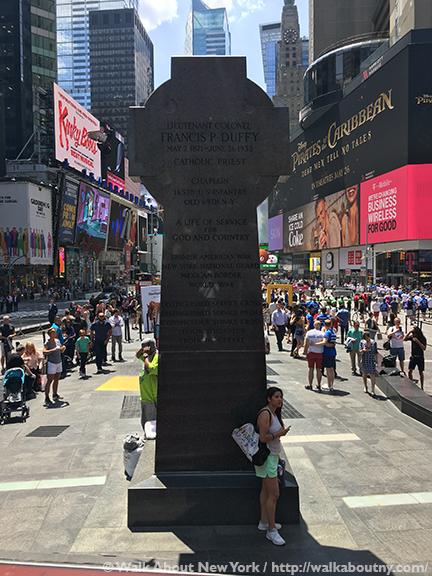 At the apex of the triangle that makes up the north end of Times Square, between 45th and 47th streets, Broadway, and Seventh Avenue, the bronze likeness of Father Francis Patrick Duffy (1871-1932) is a reminder of the range of citizens who answered the call to fight in the Great War. April 6th 2017 marked the centenary of America’s entry into the First World War; and this year marks the 80th anniversary of the unveiling of this massive stone and bronze work of art, having been dedicated on May 2nd 1937.