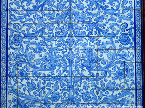 These tiles are known as azulejo. “Azulejo” comes from the Arabic “al zulaycha,” meaning little polished stone; the term is used in Spain and Portugal to refer to terracotta tiles that have an opaque glaze. Walls, fountains, walkways, ceilings, baths, fireplaces and other surfaces in Spain and Portugal have been covered and decorated with azulejo extensively since the 13th century. Tile mosaics had their origins in the Middle East and North Africa; the Romans spread their use through Europe. And the Moors reinforced their use during their 700-year-long dominance of the Iberian Peninsula. A mosaic is created not by assembling small pieces of polished marble, known as tesserae, but with fragments of glazed colored tiles. Tile murals, such as the one at 88 Perry Street, are created by assembling whole tiles, each with a part of the picture on it, like a puzzle.