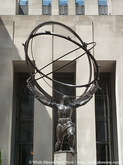 The German-born Mr. Lawrie collaborated with the American Mr. Chambellan to produce one of Rockefeller Center’s most widely-recognized artworks out of more than 50 that were created for what has become Midtown Manhattan’s centerpiece. Both men designed multiple artworks at Rock Center. Unveiled in 1937 “Atlas” is sculpted in the Art Deco style, as is the entire complex, both buildings and works of art. Cast in bronze the sculpture’s exaggerated musculature and stylized facial features and body parts are typical of the Art Deco style. “Atlas” weighs seven tons and is the largest piece of sculpture at the 22-acre complex.