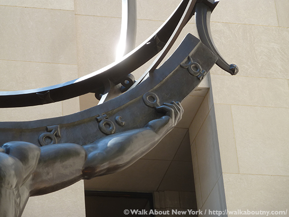 The armillary sphere’s north-south axis points to the North Star as seen from New York City, and is marked by a fleur-de-lys. Across Atlas’s shoulders sits a wide, arched beam; a frieze is displayed on it of the traditional symbols used for the planets in our solar system.