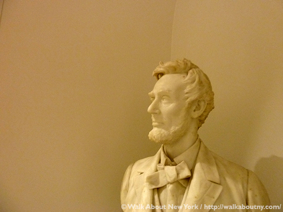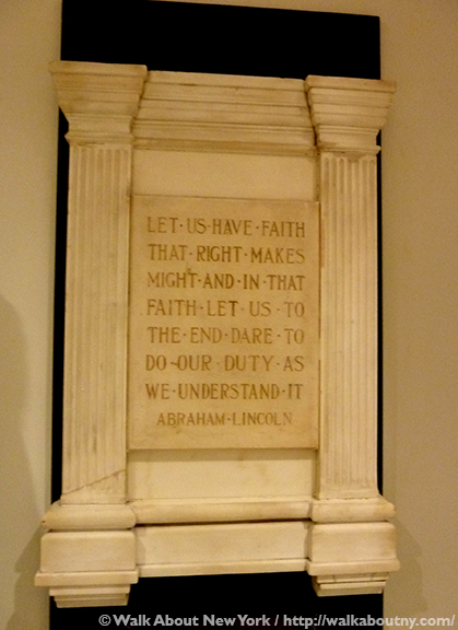 Officially the Great Hall is closed to the public except when events are held there. However, sometimes it is possible to wander in during the day; your success depends on what mood the guard is in. Enter by way of the doors facing Cooper Square; walk down the ramp to the right to the Great Hall. The Hall still uses the cast iron lectern that Lincoln and others have stood at. On a side wall of the Hall are portraits of people associated with Cooper Union, including a portrait of Lincoln as he looked in 1860. There’s also a small but excellent exhibit on the history of the Great Hall, with several busts, statues, artifacts, photographs and more. The bust of Lincoln and the plaque pictured in this article are included in this small exhibition; but no information about it was available.