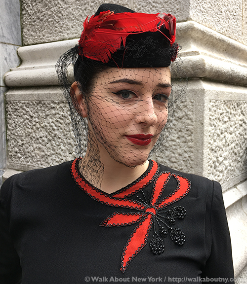 This young lady, truly elegant in a vintage veiled hat well coordinated with her dress, stands out from St. Patrick’s bright white marble.