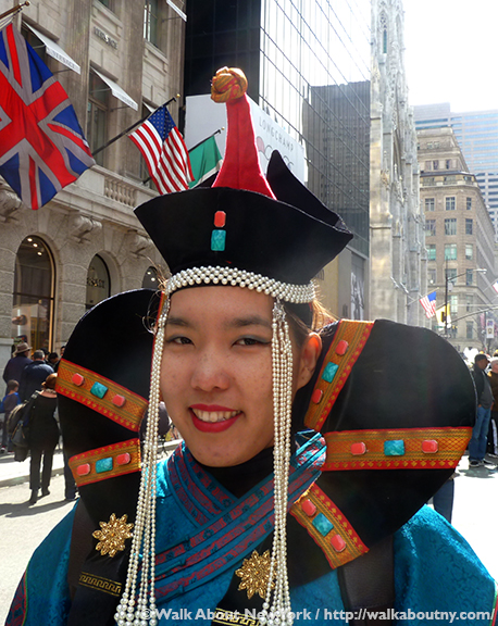 Standing outside of Cartier’s, the jewelry store, a uniquely Chinese hat and outfit added an exotic touch to the Easter Parade.