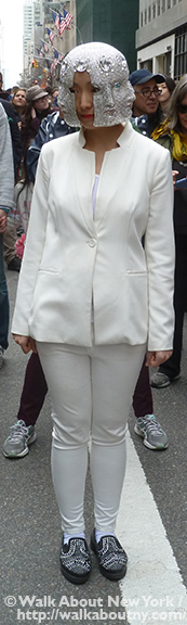 This white-suited woman wore the most disturbing “bonnet.” The cold-looking, multi-faced (with one appearing as a real human one), crystal-studded helmet rotated side-to-side as she stood still.