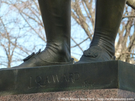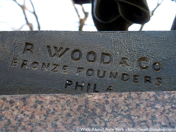 Jacob Wrey Mould (1825–1886), who designed bridges and other structures within Central Park, designed the elaborate pedestal for the bronze figure. Made of Western and Rockport granite the pedestal was carved in Scotland. A Philadelphia foundry, the Robert Wood & Co., cast the sculpture in 1870. Contemporary critics found the work by turns a noble figure or a costume piece.