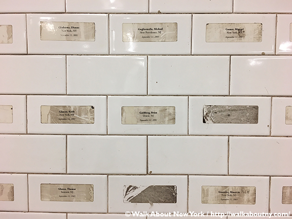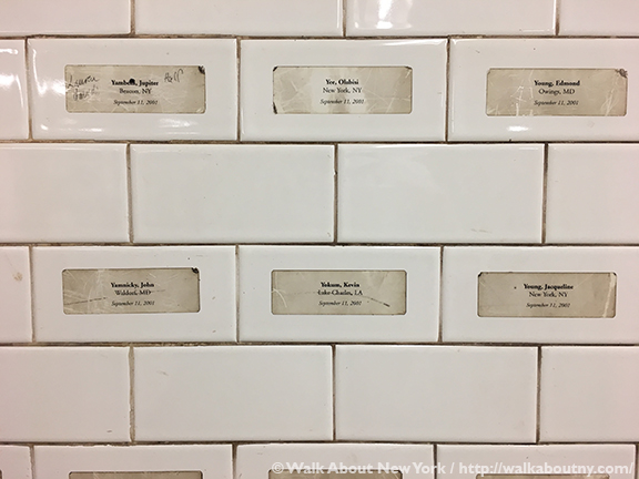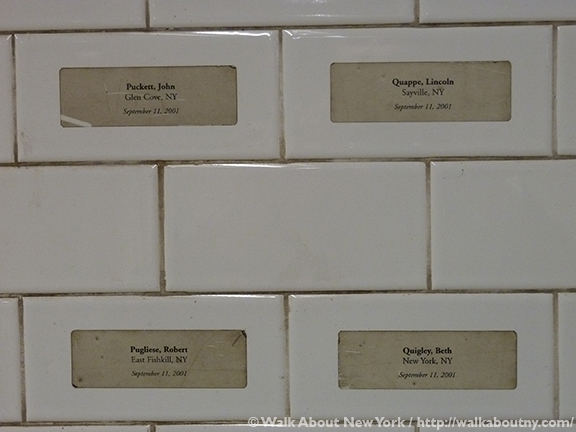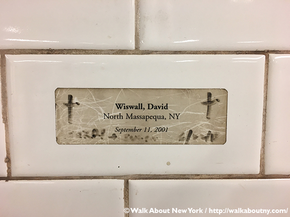Just past the station’s police precinct along the corridor, connecting the R/Q/W/N trains to the 4/5/6 trains, this understated wall of remembrance to the thousands of casualties of the September 11 attacks on the Twin Towers stands in unassuming silence.
