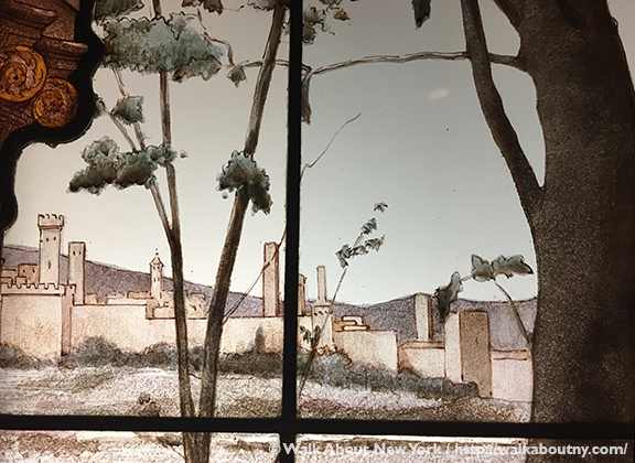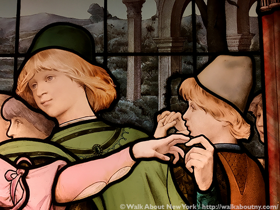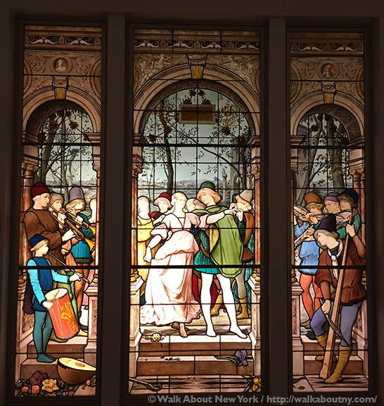 Set at a villa in the countryside outside the city-state of Florence, which can be seen in the background, the artwork is titled “La Danse des Fiançailles (The Engagement Ball).” The window is made up of many pieces of colored glass, forming the costumes, instruments, and much of the architecture; but the facial features and some of the building decorations are painted onto the glass.