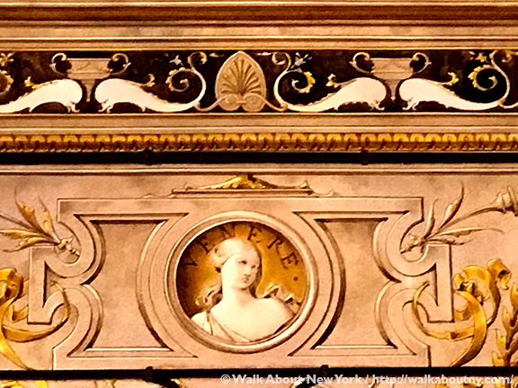 Above the arch in the right hand panel is a portrait of the Roman god of war, Mars. He and Venus fell in love. This unlikely union symbolizes that love can conquer all, even an arranged marriage!