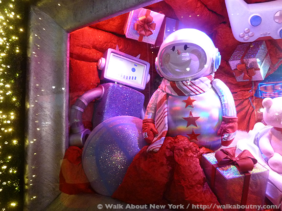 We next take a look a few of Macy’s Broadway windows. They tell the story of Sunny, the Snow Pal; she helps save Christmas when she repairs Santa’s sleigh, which has broken down in outer space.