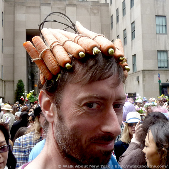 This clever parade-goer raided his refrigerator bin to make his bonnet; after the parade he could have gone home to cook carrot soup or bake a carrot cake.