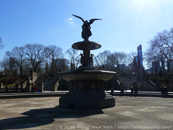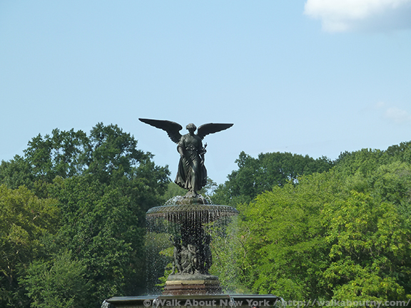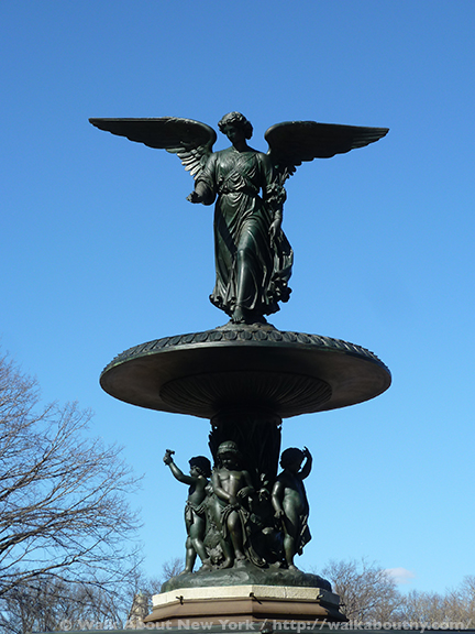 Celebrating the Croton Aqueduct, which became operational in 1842, bringing fresh water into New York City from the neighboring county of Westchester, the Bethesda Fountain, and its Angel, styled in Neoclassical composition and dress, were meant to be the only sculptural feature in Central Park. Bethesda Fountain was the only sculptural work of art in the original, winning design plan put forth by Frederick Law Olmsted (1822-1903) and Calvert Vaux (1824-1895) for Central Park. The designers wanted nature to be the art! At a height of 26 feet and a diameter of 96 feet, it remains one of the largest fountains in the City.