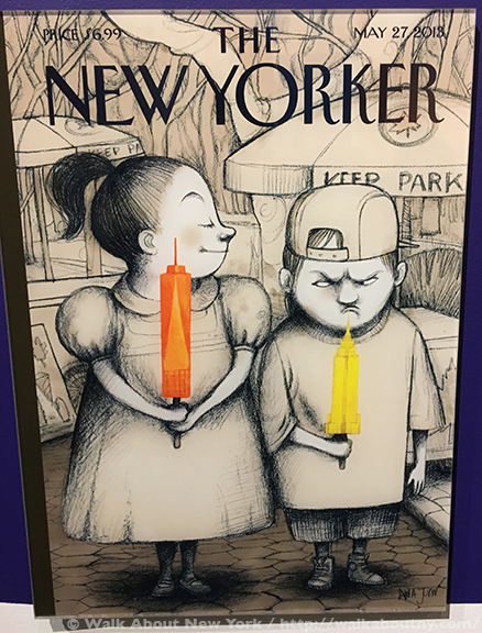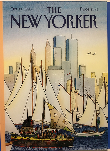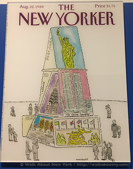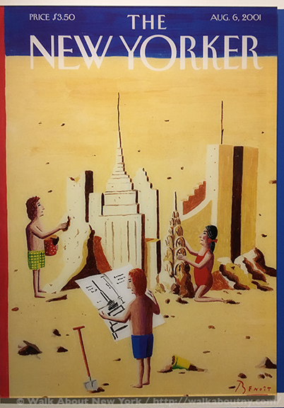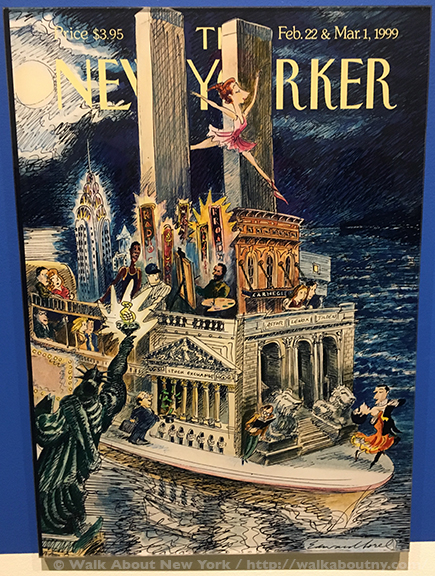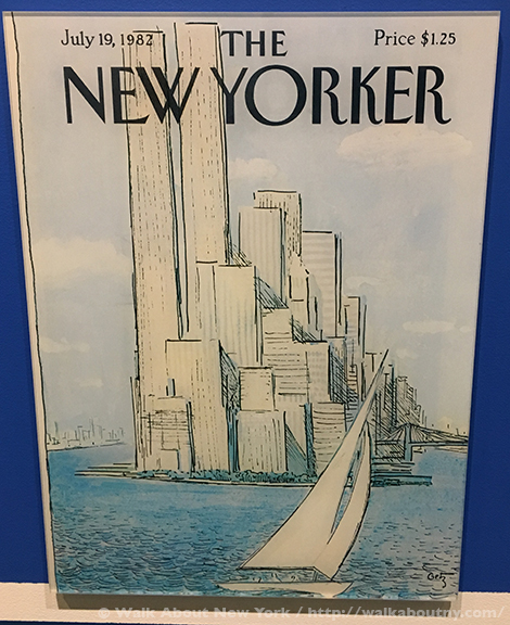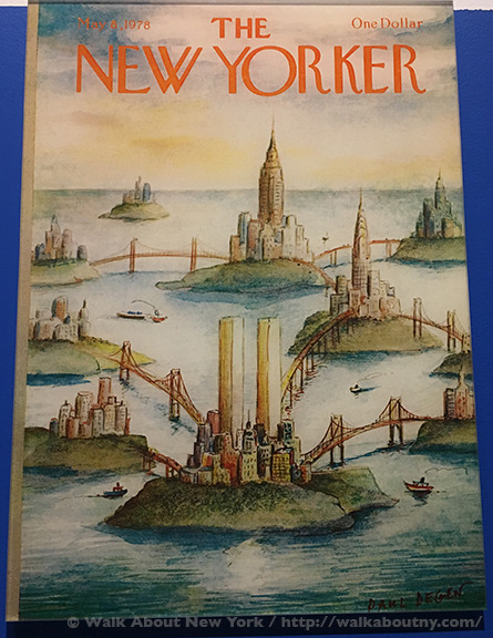 In 2017 the National 9/11 Memorial Museum held a special exhibition of covers from “The New Yorker,” that quintessential New York magazine. Only covers that had shown illustrations of the Twin Towers were displayed. From the earliest days of the Towers to a watery, reflective image of them on the September 12th 2001 cover to the present-day redesigned World Trade Center site, “The New Yorker” covers show how these landmarks were an integral part of the Big Apple’s image and identity. Condé Nast, publisher of “The New Yorker,” is the anchor tenant at One World Trade Center.