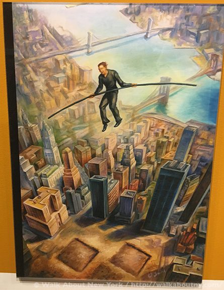 Inspired by the August 1974 high-wire stunt made by Philippe Petit (1949–present), this cover celebrates his back-and-forth walk on a 131-foot-long cable that he and his partners had strung between the Twin Towers. Without a net he balanced for 45 minutes 1,350 feet above the World Trade Center Plaza.