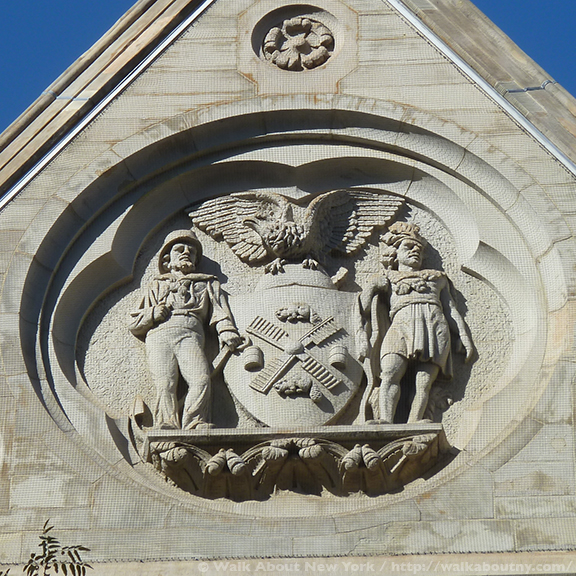 Facing out from the Seal itself, a sailor occupies the dexter, Latin for “right,” position. The sailor, because of the Latin name for his position, is named Dexter. He holds a lead plummet, used for measuring water depths, in his right hand. Some mistakenly say he is holding a plumb, a carpenter’s tool. Including the sailor recognizes the importance that shipping played in the economic development of New York. From 1830 until the 1950s New York was the busiest port in the world.