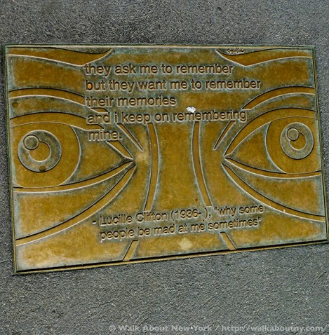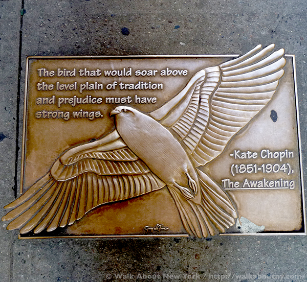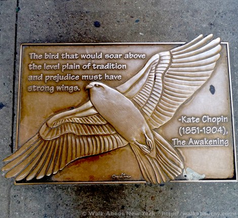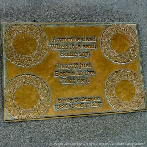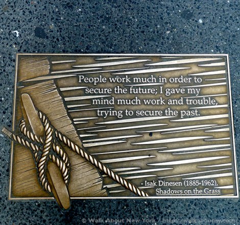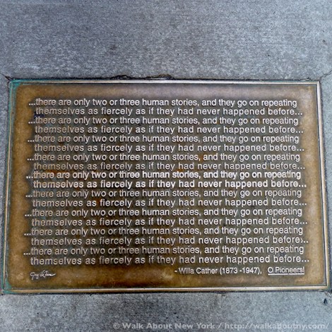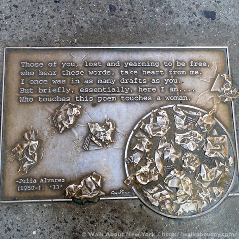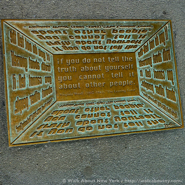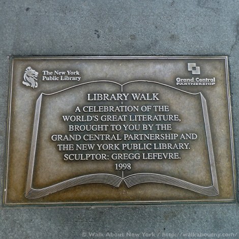 Although the tendency in New York City is to look up at the skyscrapers, strolling along Library Way, as this two-block stretch has been officially known since 2003, offers a good reason to look down. For embedded in the sidewalk are 97 plaques; each one features a quote from a book artfully and often cleverly illustrated. Adding context, the book’s title and its author are listed.