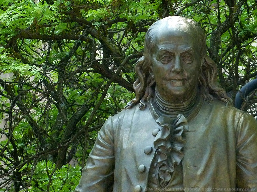 Including an issue of the “Pennsylvania Gazette” in his left hand, Mr. Franklin is shown as a printer. He was a true polymath. He experimented with electricity, the oft-cited use of a kite as a conductor during a lightning storm; he invented an open stove for home heating, called the Franklin stove; bi-focal eyeglasses; and the lightning rod. Because of the high-traffic location, it has suffered environmental damage. Between the 1940s and the 1980s the monument was conserved four different times. The most recent conservation effort of the statue and the pedestal was carried out in 1999. Another reminder of this Founding Father is a playground. Bearing the name of Benjamin Franklin’s alter egos, Poor Richard Saunders, Poor Richard’s Playground is located at East 109 Street between Second and Third Avenues in Manhattan. Franklin Street in Manhattan’s Tribeca neighborhood was named for him in 1811.