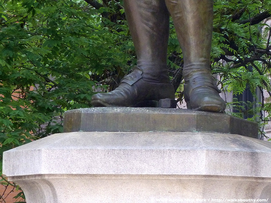 A small triangular plot of green next to 41 Park Row, formerly the New York Times headquarters, now belonging to Pace University, is home to this bronze of Mr. Franklin. For decades Park Row was the center of New York City’s publishing industry and newspaper businesses. Because of Mr. Franklin’s fame as a printer of paper currency and a publisher of newspapers and almanacs, is why this location, Printing House Square, is appropriate. This square is located opposite to City Hall; in the colonial era it was a common meeting ground. The Declaration of Independence was read there by George Washington on July 9th 1776.