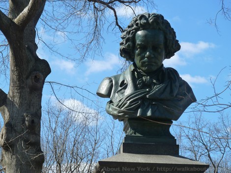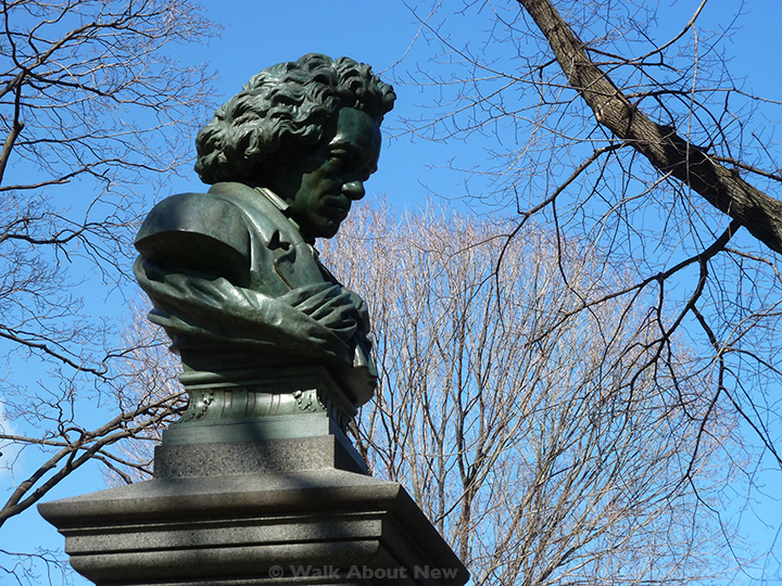 Standing in the area of Central Park where free public concerts have been held for decades, this bronze bust of Ludwig van Beethoven was sculpted by the German-American sculptor Henry Baerer (1837–1908). Resting on a polished, Barre granite pedestal this tribute to the composer stands where a Victorian-era bandstand was once used by musicians to entertain strolling New Yorkers on Sunday afternoons. Among those enjoying the concerts were an increasing number of German immigrants.