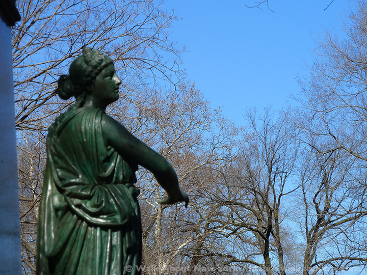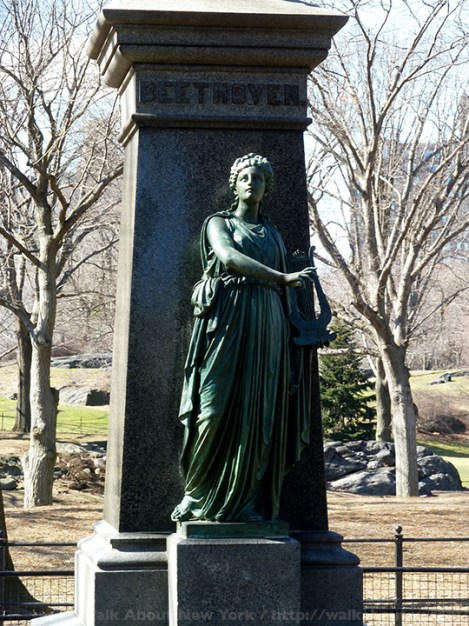Beethoven is depicted with his unmistakable lion-mane-like hair and an intense expression, meant to show his musical greatness. Below the bust stands a bronze allegorical female figure; this is the “Genius of Music,” holding a lyre. Originally the monument stood where the Naumberg Bandshell is today; it was moved when bandshell was completed in 1923. At a height of 17’2″, a width of 6’7″, and a depth of 6’7″ the memorial is roughly at 71st Street, on the City’s grid plan, placing it midway within the Park.